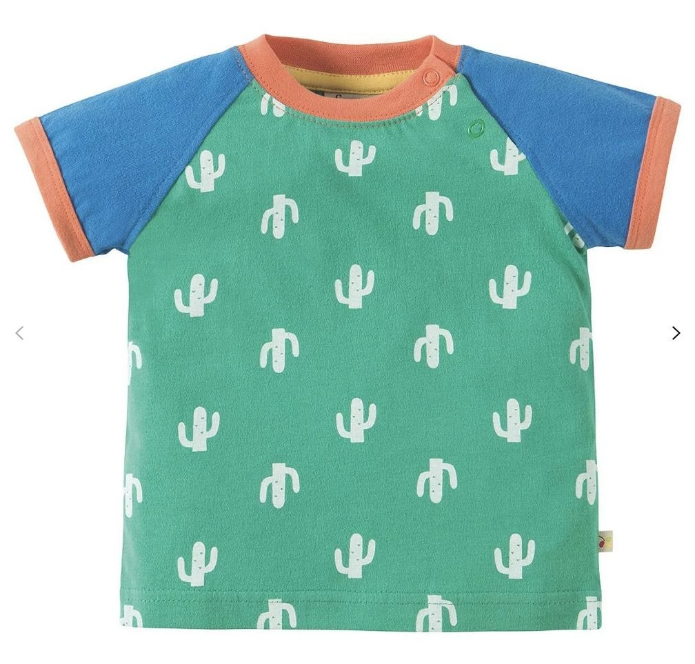 This adorable cactus t shirt from Frugi Organic is a great way to spruce up baby’s daytime collection. Made from organic cotton for the softest feeling against baby’s skin, this short sleeve top features popper fastening at one shoulder for easy dressing finished with an all over cactus print and contrast sleeves. Eco-friendly brand Frugi is definitely something to get excited about- since 2004 they have strived to provide beautiful clothes which are soft on sensitive skin, stand up to everyday adventure, comfortably fit cloth nappies and are kind to the world we live in. 100% GOTS & Organic Soil Association Certified Organic Cotton Machine washable at 40º. Medium Tumble Dry