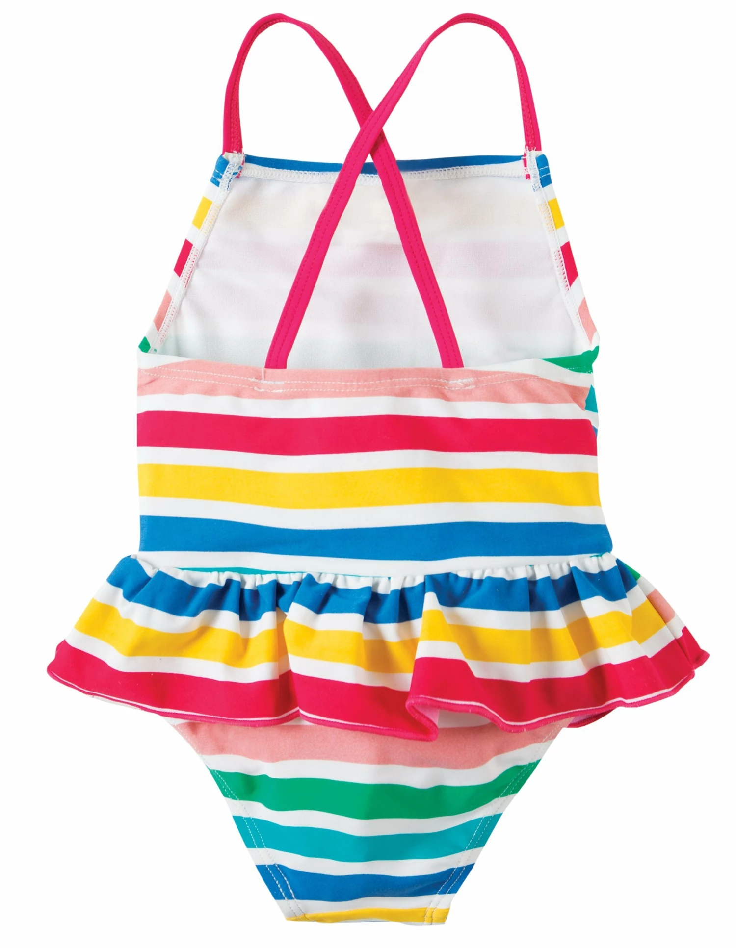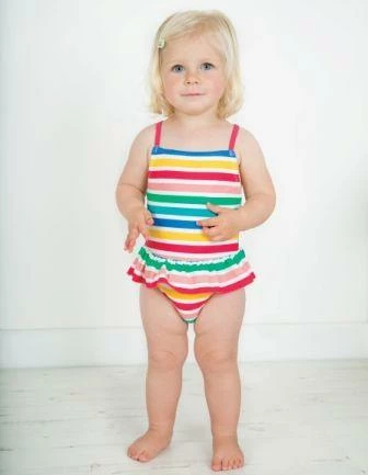 This colourful Summer Stripe swimming costume from eco friendly brand Frugi features cross over straps at the back, UPF 50+ protection and a fun flouncy skirt. 80% Nylon, 20% Elastane. Machine washable at 30º.