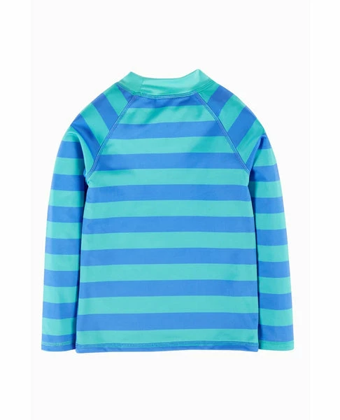 Surf’s up with our Sun Safe Rash Vest! Perfect for protecting your kid from the sun’s harmful rays, the high neckline and long sleeves will help keep their elbows and necks covered during their seaside adventures or when splashing about in the pool. From our Swimwear collection, this kids’ rash vest matches with our Harbour Swim Hat and Board Shorts or Tidal Wave Trunks to create a set that’s ready to ride the waves! Protecting the planet they play on, we’ve made this swimming top from post-consumer recycled plastic bottles! • Made from 85% Recycled Polyester Repreve and 15% stretchy Elastane• This fabric has a UPF 40+ rating, which keeps delicate skin safe in the sun• In a Cobalt Blue design with a contrasting Aqua Cobalt Stripe on the sleeves and back and a fun Shark Boards print on the front• This sun safe garment conforms to European Standard EN13758-2 UPF 40+ to keep delicate skin safe by blocking the harmful rays of the sun• UV protection factor blocks the harmful rays of the sun and provides UVA and UVB protection• PLEASE NOTE: If used regularly, or for long periods of time, in chlorinated water then the bright colours can fade and damage to the fabric might occur – please remember to rinse me thoroughly with fresh water after use!• Coordinates with our Swimwear range• We highly recommend using the Guppyfriend to wash this rash vest! WARNING:• Sun exposure causes skin damage.• Only covered areas are protected. This garment does not replace sunscreen. Always apply a high factor sunscreen.• The protection offered by this garment may be reduced with use or if stretched or wet.• Stay in the shade between 11 am and 3 pm.• Keep babies out of the sun.• Always remember your sun hat and sunscreen! Material: 85% Recycled Polyester Repreve, 15% Elastane