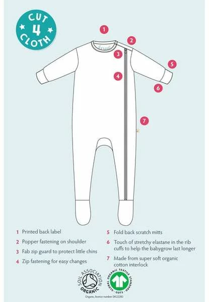 Organic Cotton Interlock Zoom! Zoom! Great for getting your little one ready for bed in a flash, our Zip Up Babygrow has a handy zip fastening on the front that allows for super quick nappy changes and easy peasy dressing. In our new slimmer fit design, this long-sleeved sleepsuit has fold-back scratch mitts on the cuffs of sizes up to 12 months to help prevent your little one from scraping their face or nose. Twinning: Great for sibling matching with our Port Isaac Pyjamas for older kids! Made from GOTS certified Organic Cotton Interlock Touch of stretchy Elastane in the rib cuffs to help the sleepsuit last longer and for extra comfort Beautifully soft and cosy In a colourful Racing Rockets all over print Contrasting Cobalt Blue binding and cuffs Fab zip guard with popper fastening on the shoulder Double-layered cosy feet to protect tiny toes Printed back label Cut4cloth: Designed to fit over fluffy cloth nappies PLEASE NOTE: This is a new style of snug, close fitting organic cotton nightwear. Close fitting garments are less likely to catch fire, so this style is designed to fit snugly and adheres to 16-CFR 1615 & 1616 standards. Made from a specially developed 100% Organic Cotton Interlock, not flame resistant. For child’s safety, garment should fit snugly. This garment is not flame resistant. Loose fitting garment is more likely to catch fire.