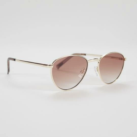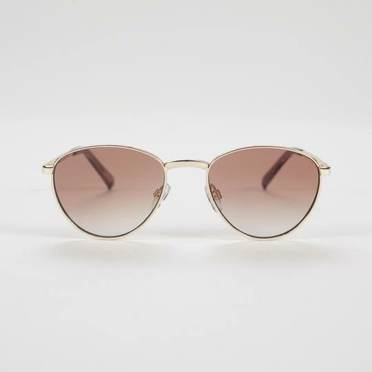A flattering pair of aviator style sunglasses for sunny days featuring a bright gold frame and tan brown lens, slightly triangular shaped lenses. The Hot Stuff Sunglasses from Le Specs have good UV protection and are designed to flatter.