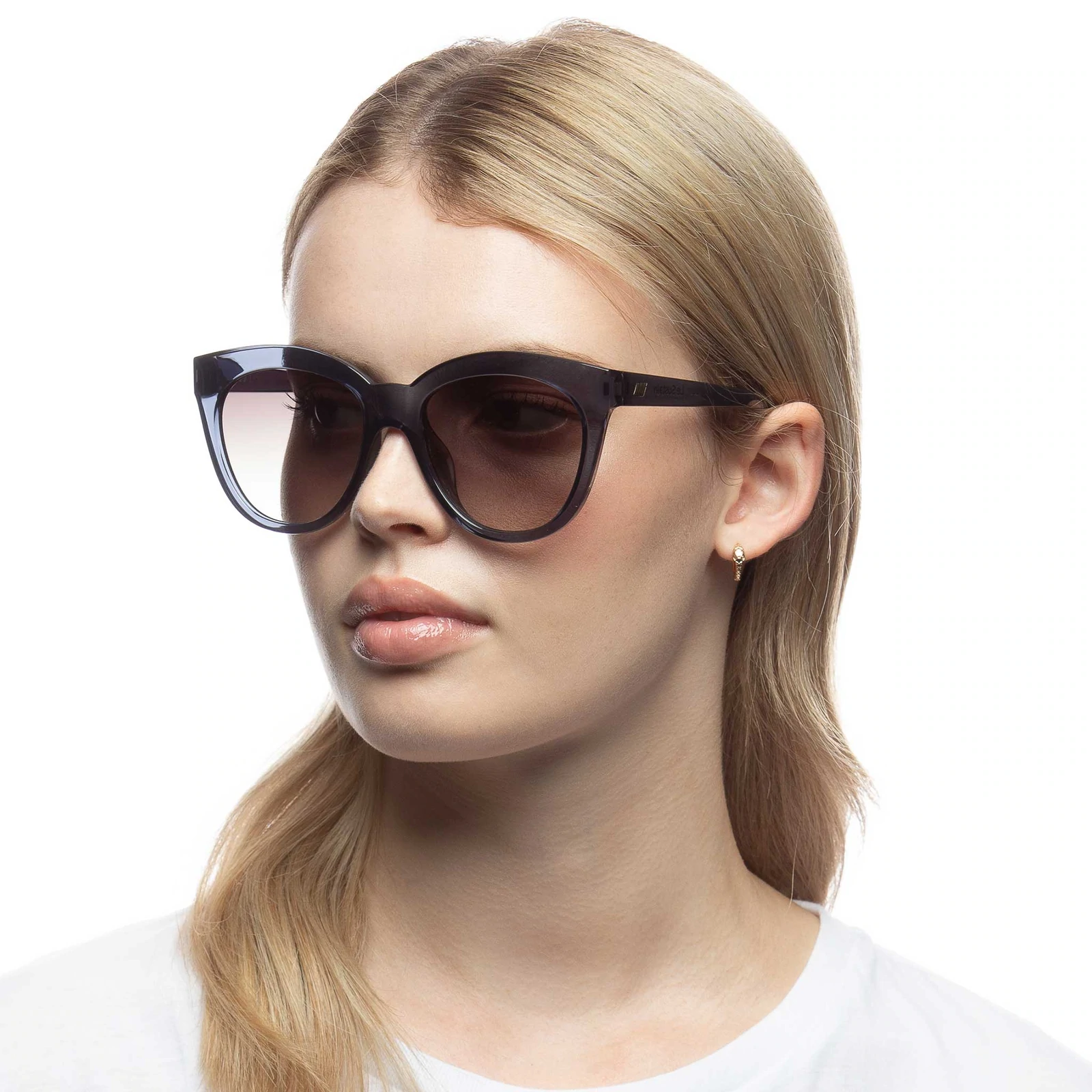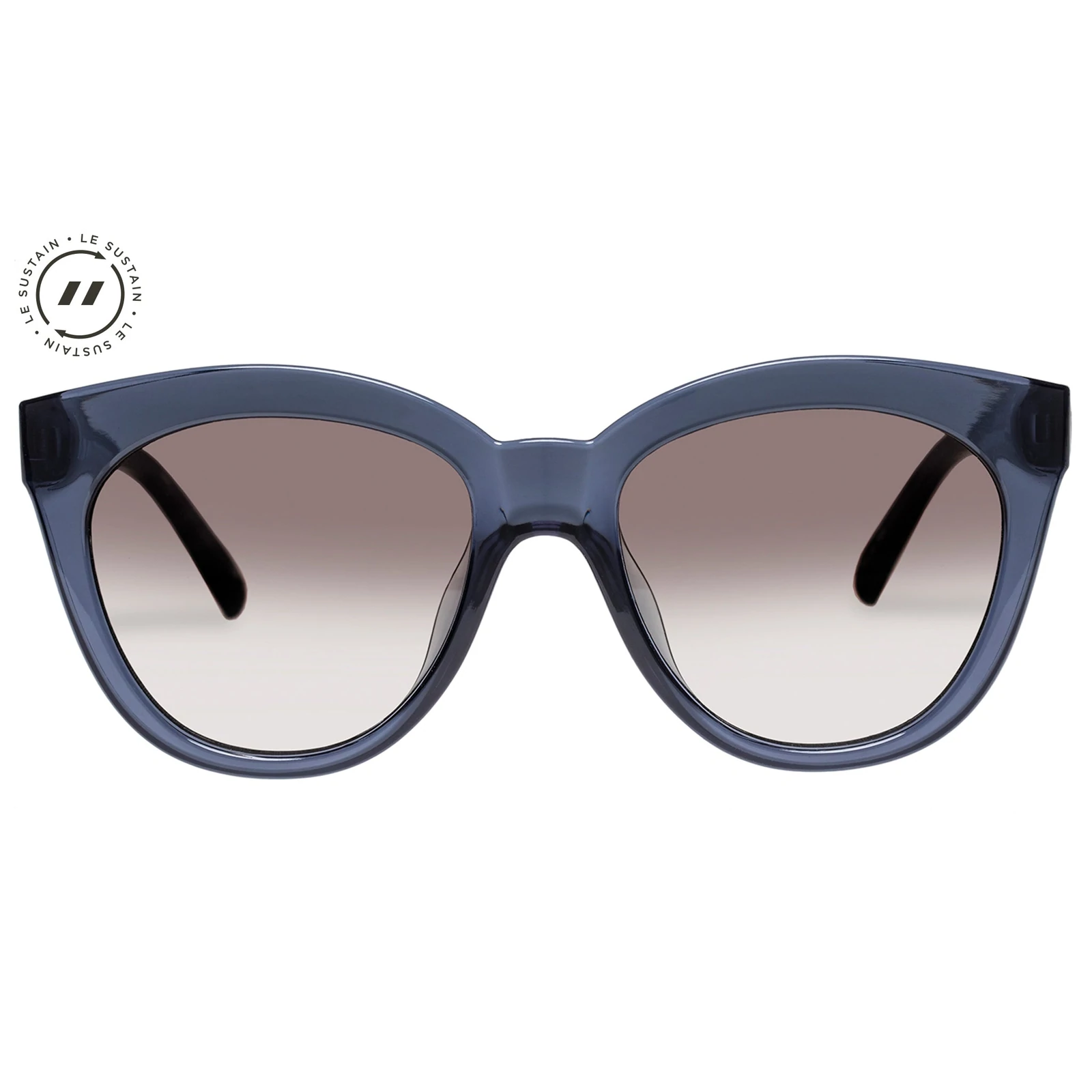 FRAMES MADE FROM: 100% BPA FREE RECYCLABLE PLASTIC. Updating the iconic Halfmoon Magic silhouette with thicker and more modern proportions, RESUMPTION is the perfect cat eye sunglass to suit all face shapes. Designed as part of the Le Sustain collection, these sunglasses offer midsize proportions and are made from recyclable materials.. Finished in deep translucent grey blue recyclable frame with soft gradient lenses for an effortless feminine look. Fitted with shatterproof and scratch resistant polycarbonate lenses.