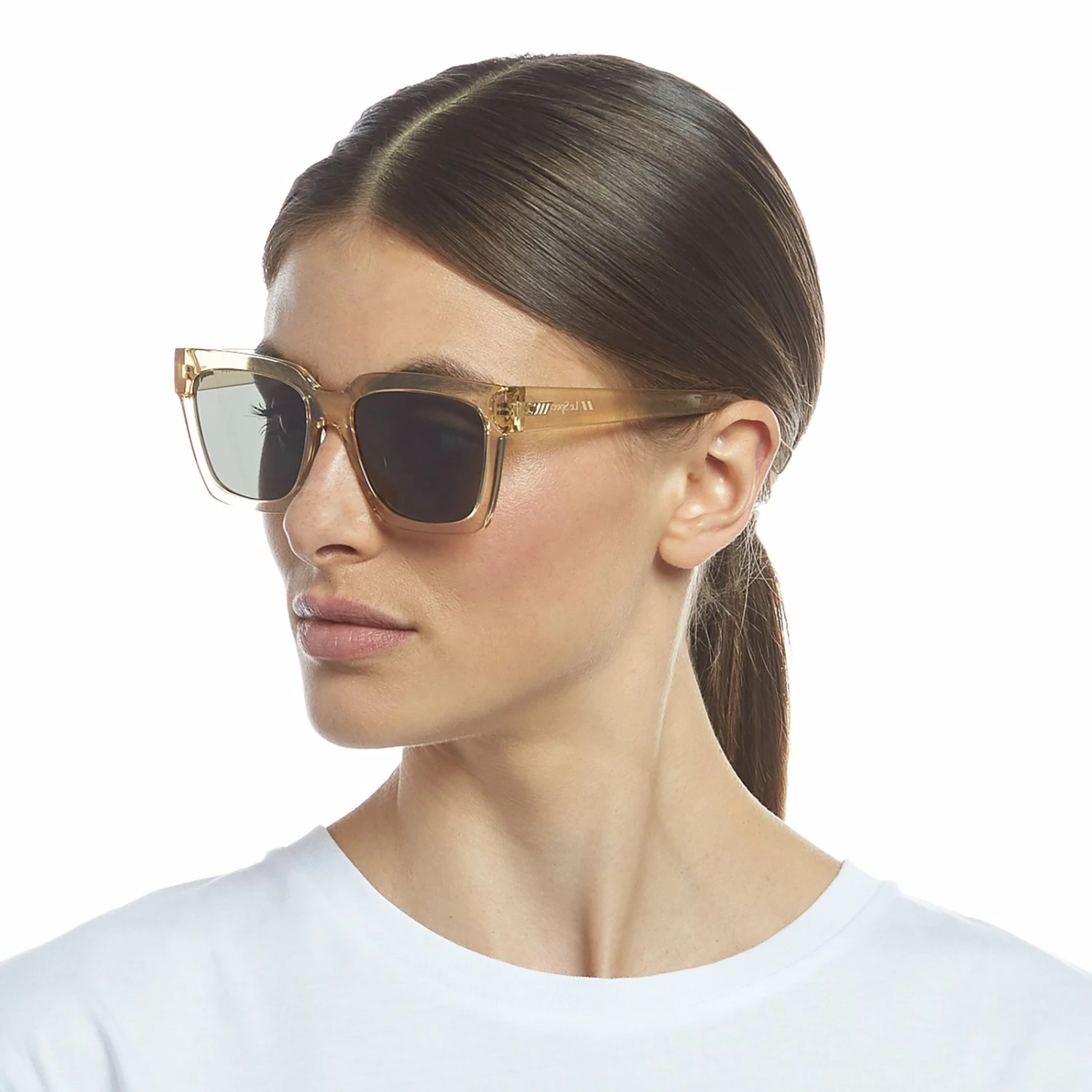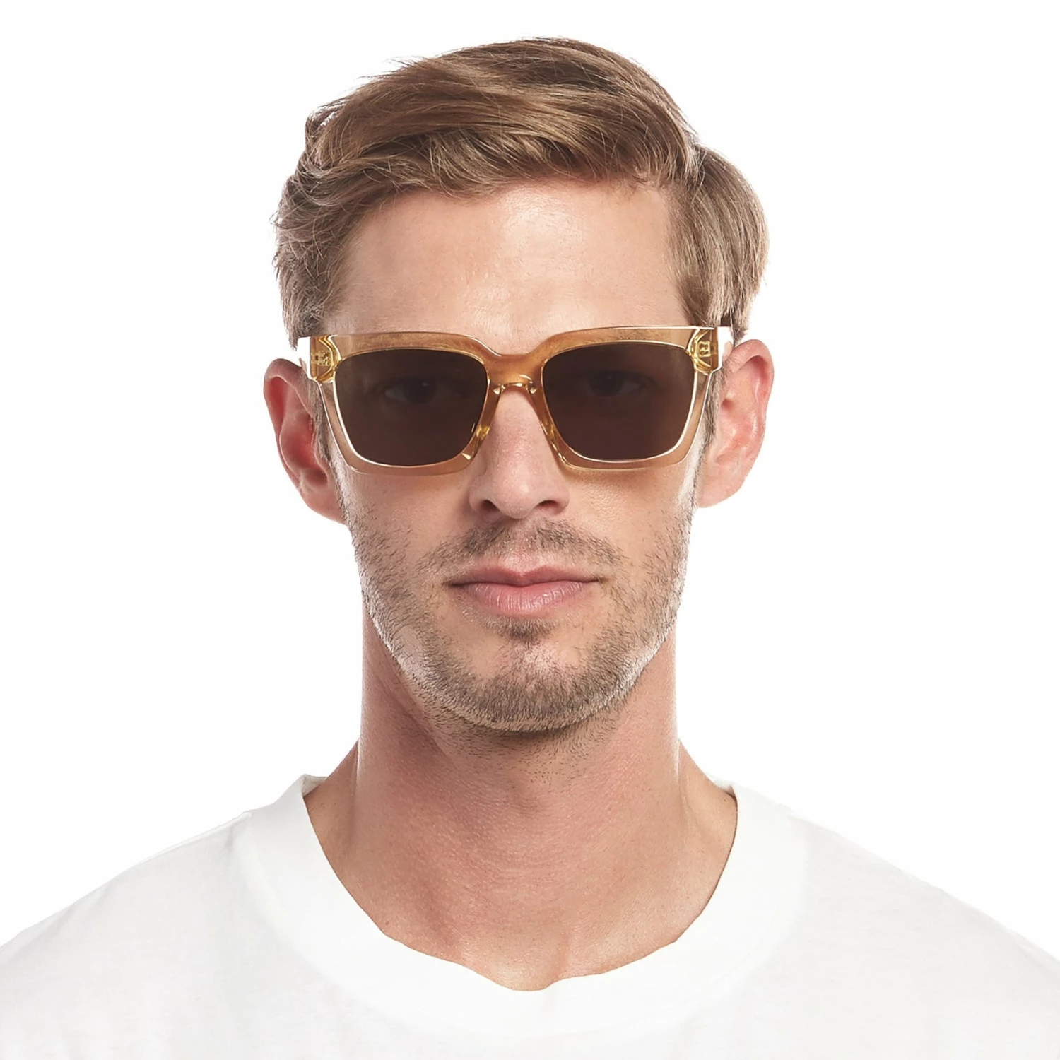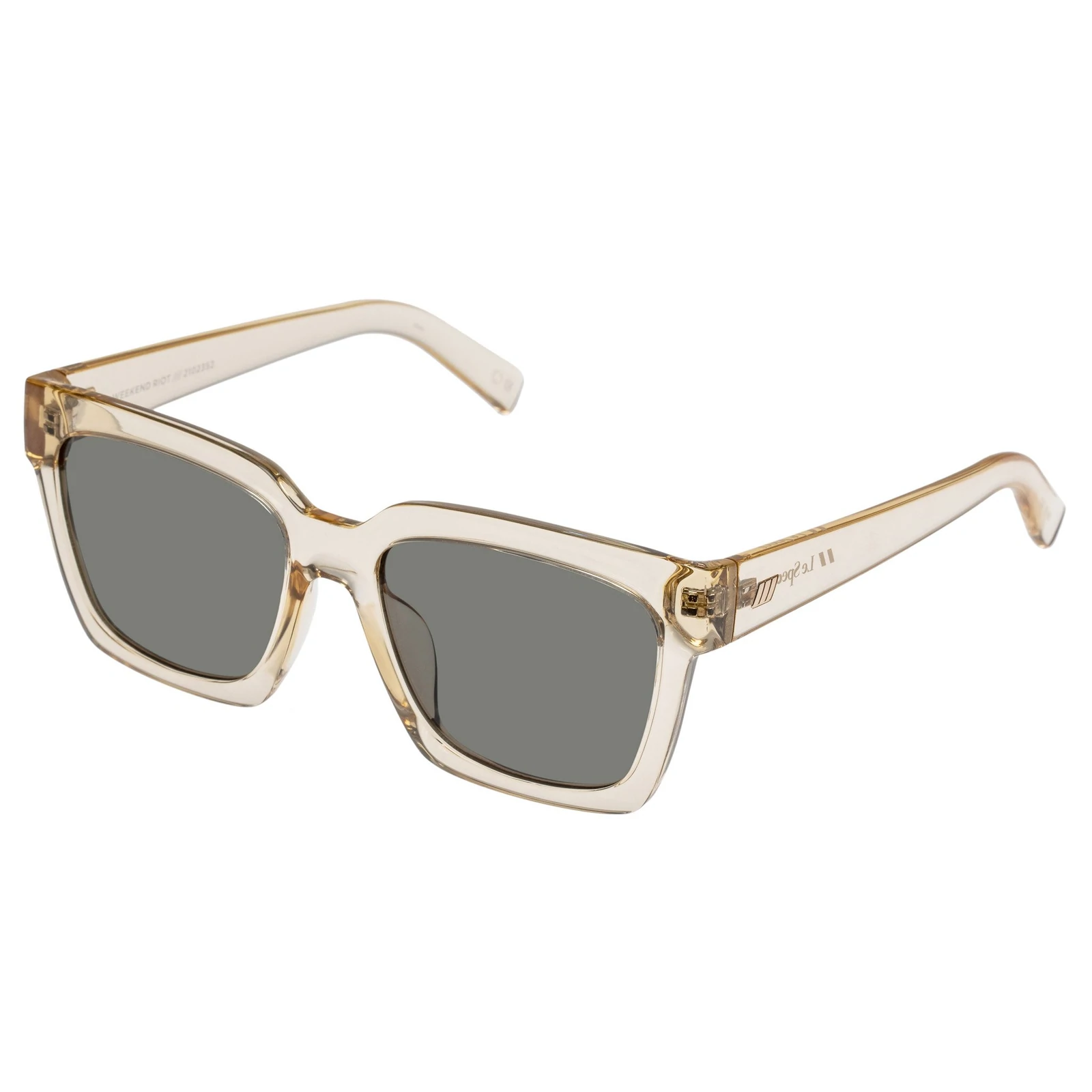 Offering an oversized fit for larger faces, WEEKEND RIOT is a modern D-frame silhouette that focuses on comfort and fit. With lenses fitted to provide maximum UV protection, each style is subtly finished with iconic Le Specs flag stripe metal hardware on both temples. Finished in a vintage translucent sand frame paired with contrast dark lenses. Made using BPA free polymer plastic which is lightweight, durable and impact resistant. Fitted with shatterproof and scratch resistant polycarbonate lenses.
