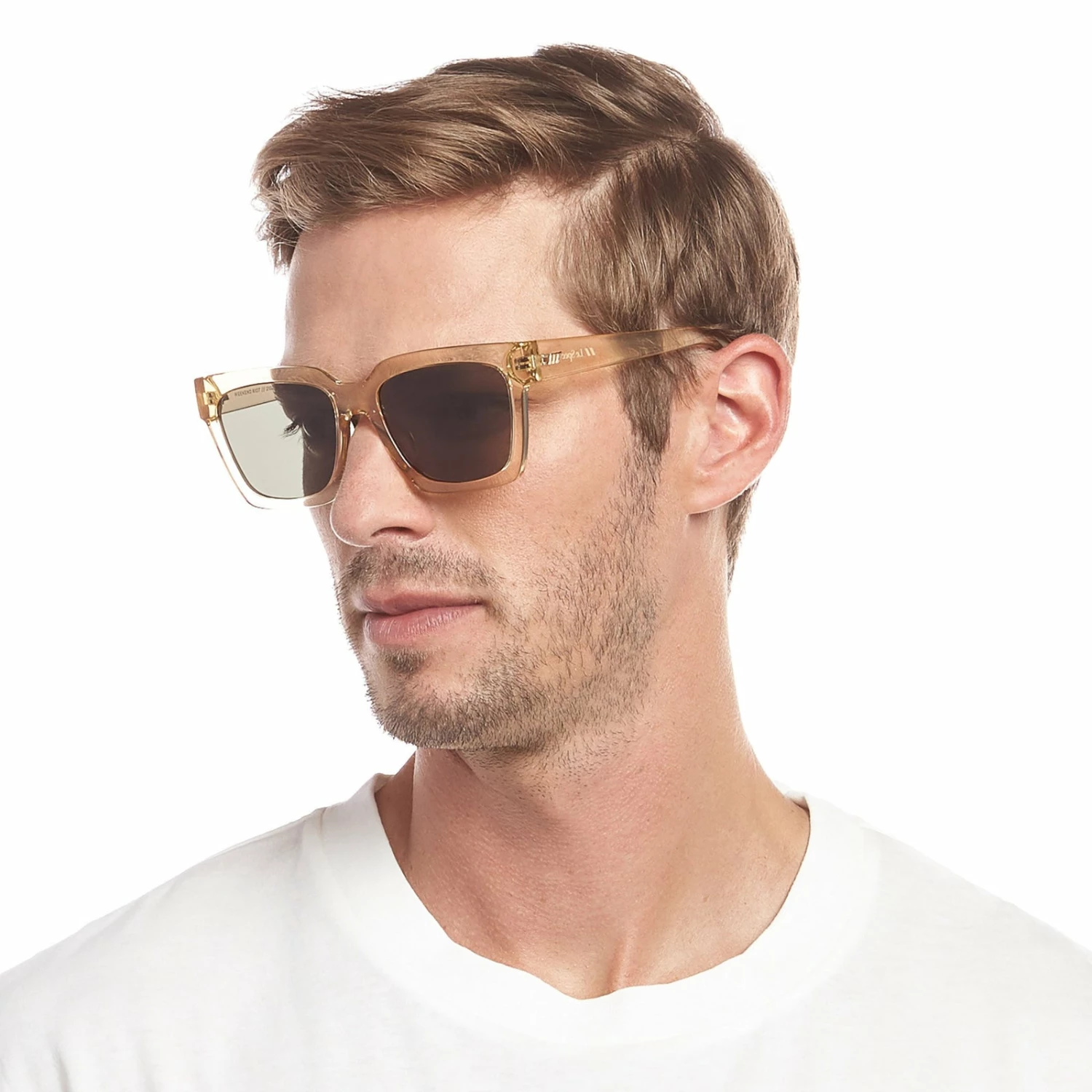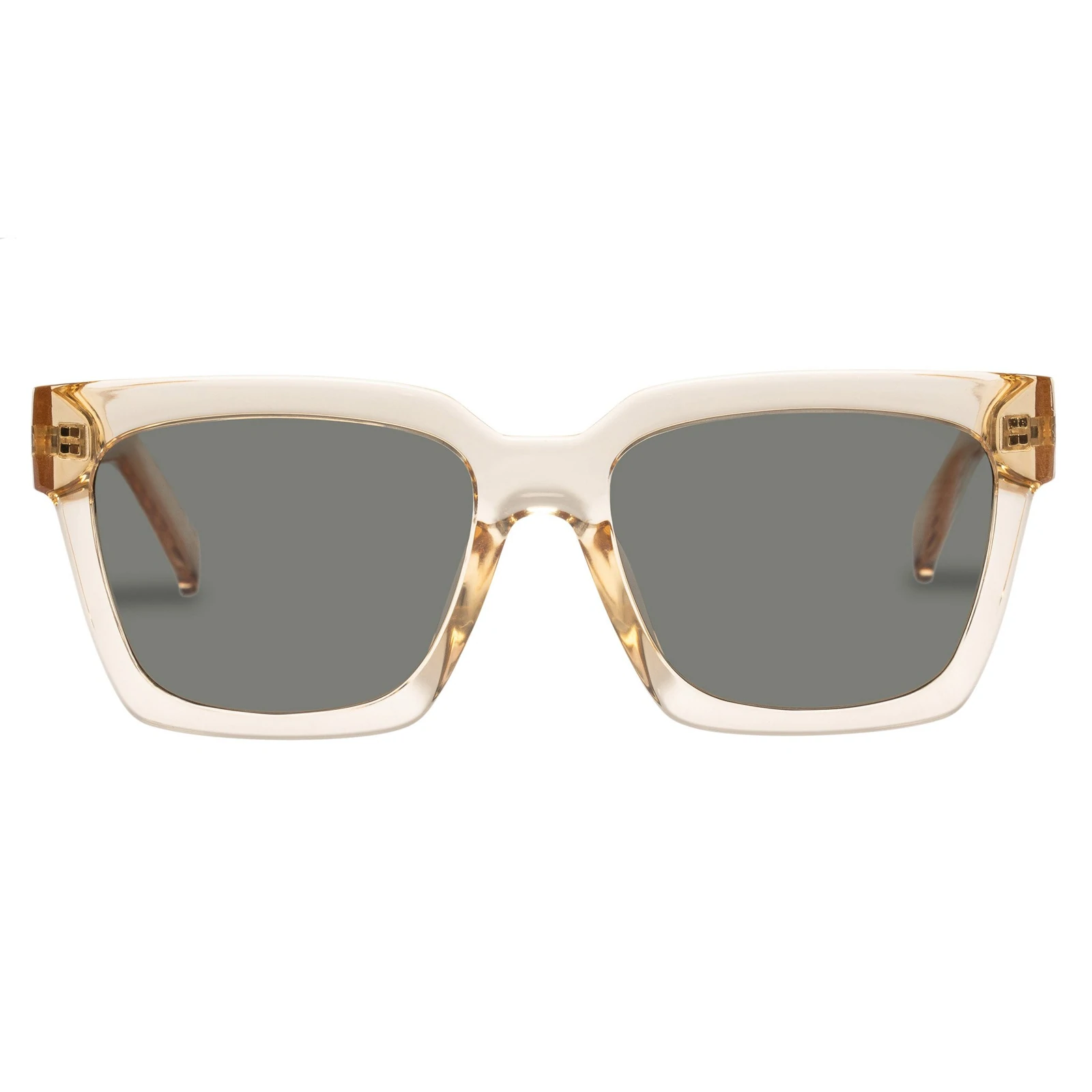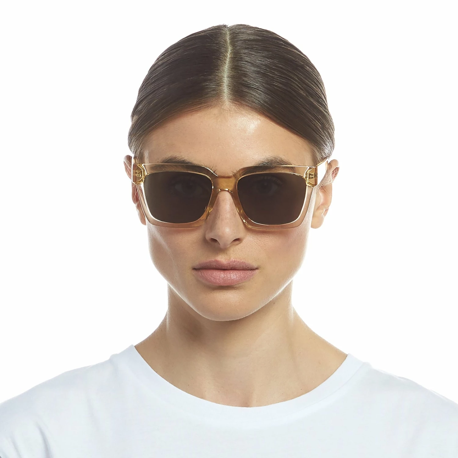 Offering an oversized fit for larger faces, WEEKEND RIOT is a modern D-frame silhouette that focuses on comfort and fit. With lenses fitted to provide maximum UV protection, each style is subtly finished with iconic Le Specs flag stripe metal hardware on both temples. Finished in a vintage translucent sand frame paired with contrast dark lenses. Made using BPA free polymer plastic which is lightweight, durable and impact resistant. Fitted with shatterproof and scratch resistant polycarbonate lenses.