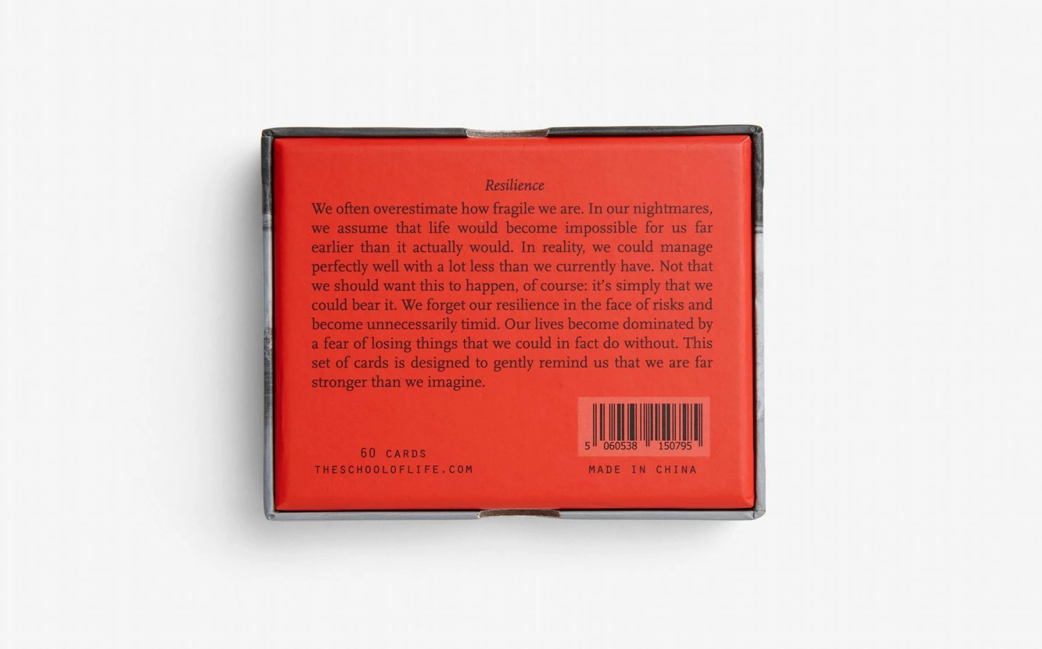 We often overestimate how fragile we are. In our nightmares, we assume that life would become impossible for us far earlier than it actually would. In reality, we could manage perfectly well with a lot less than we currently have. Not that we should want this to happen, of course: it’s simply that we could bear it. We forget our resilience in the face of risk and become unnecessarily timid. This set of cards is designed to gently remind us that we are far stronger than we imagine.